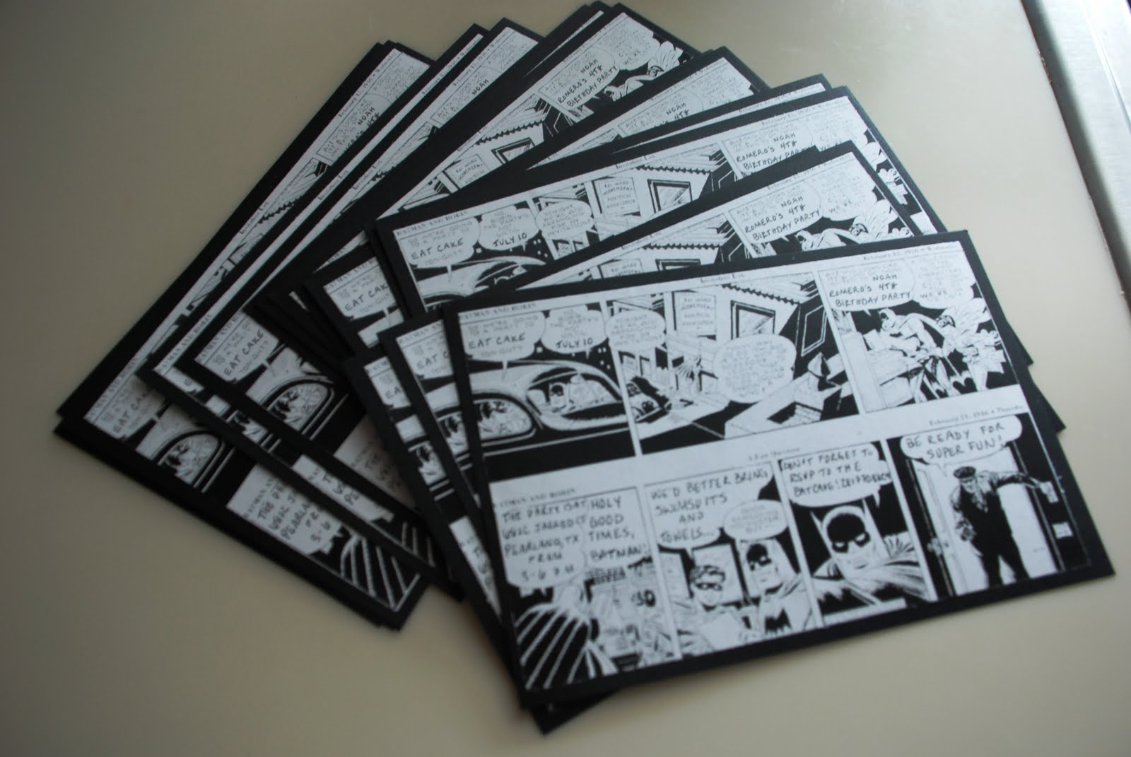 website with archives of the actual 1940s "Batman & Robin" comic strip. I personalized it to include the details of the party, pasted it to black card stock and, voila! Homemade invitations.